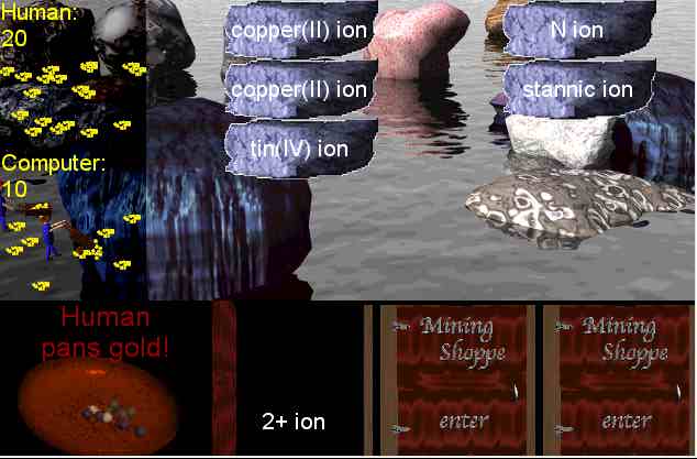 In the 49er Gold Rush chemistry game, you match Mining Tools to Rocks by matching Mining Tool terms to Rock definitions (or meanings). The 49er Gold Rush Chemistry games use the same kind of database engine as the 49er Gold Rush Language games. You may also add your own spoken words and phrases to augment the game database. You pick from a variety of topics, or create your own. For example, you can choose to practice ion charge and formula - in which case the Mining Tools will bear the possible ion charges, and the Rocks will bear the names and formulae for ions.