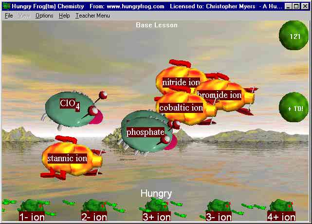 In the Hungry Frog chemistry game, you match frogs to bugs by matching frog terms to bug definitions (or meanings). The Hungry Frog Chemistry games use the same kind of database engine as the Hungry Frog Language games. As in the language games, spoken definitions correspond to the Terms you define and you can easily add your own spoken words and phrases.