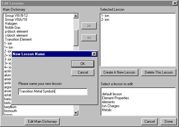 We will go through some examples of adding Terms and definitions to the main dictionary and editing existing Terms and definitions for the Latin game. The same procedures apply to both the Language games and the Chemistry games. Instructions here apply to both and some examples show language dialogs. We will also show how to manage your lesson lists and create your lessons, and we will show you how to have your students pick Terms to practice from lesson Term lists.