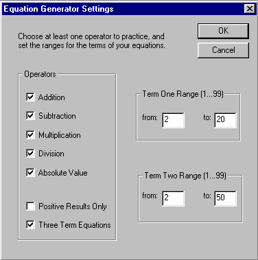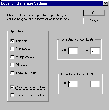 The game can be configured to teach an extremely wide variety of math skills. For example, it is easily configured to run as an application dedicated to practice of multiplication tables only. The game may also readily be set up to focus solely on the most basic principles of addition or subtraction. The game only quizzes on the equation sets defined in the equation generator dialog and does NOT presume to know better than you do what problems to present to you (or your child). Equations are only generated within the bounds of the specified parameters. If you feel the equations generated are too simple or too complex, you merely change the parameters to adjust play accordingly.