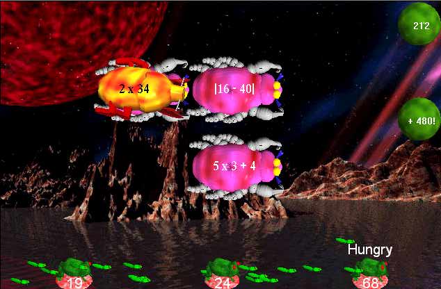 In Math Arithmetic, you match frogs to bugs by matching solutions to equations generated by the Equation Generator. The generated equations appear on the bugs in the game display, and corresponding solutions to the equations appear on the frogs in the game display.