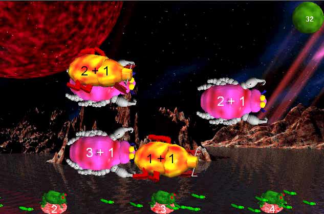 In the following example, you have configured the game to teach the most basic arithmetic. You have set the equation generator to create 2 term equations, with the value of the first term 1, 2 or 3 and the value of the second term fixed at 1. The result is the three equations: 1+1, 2+1, 3+1 for the Bugs and the values: 2, 3, 4 for the corresponding Frogs in your Game World. The sample screen shot shows the Game World screen for these "simple addition" equation generator settings.