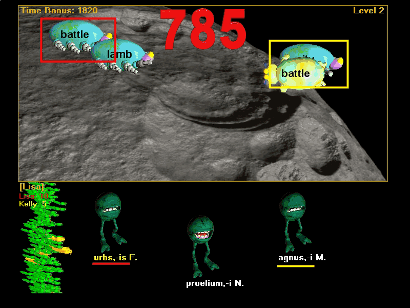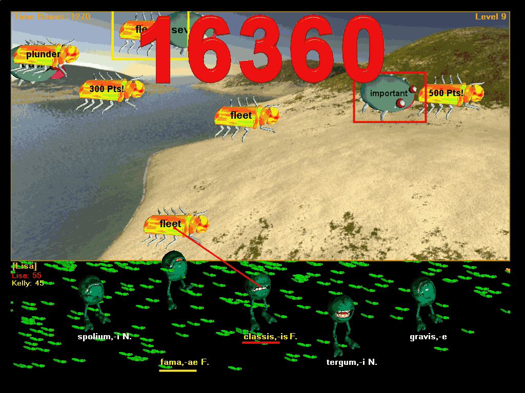 A Two Player Game in progress [Movie may be slow to load completely]. Note that two players can both be on the same frog at the same time, and the same bug can have both players' bug cursors on it at the same time, and any player can get a bonus bug as soon as his or her bug cursor lands upon that bug: