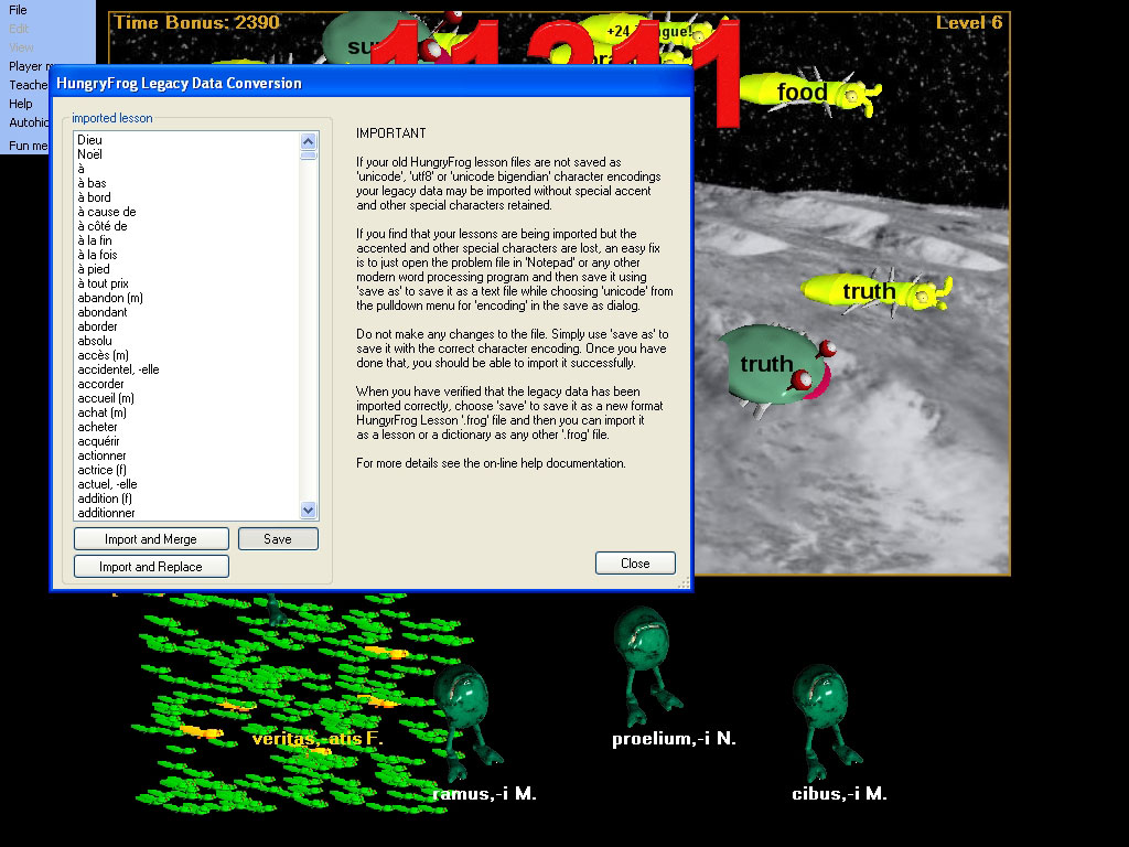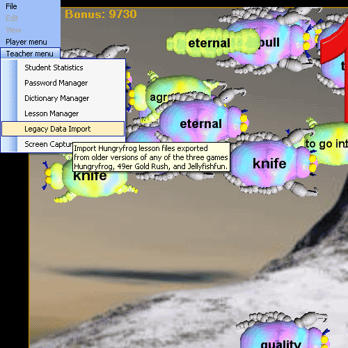 The Teacher Menu Legacy Data Import menu item allows you to import saved study lists and vocabulary lists from older software versions including Latin language software, Homeric Greek language software, French language software, German language software, Italian language software, and Spanish language software of any of the Hungry Frog series, Jellyfishfun series or 49er Gold Rush series games older than v6.0 software.