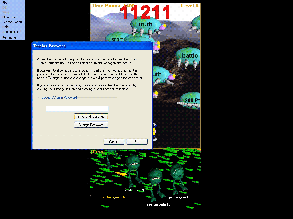 Teacher Password Window in Latin language software v6: