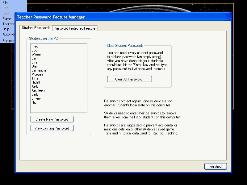 The Teacher Menu Password Manager is where you change Teacher passwords and set password protection for game features as well as manage student passwords as a teacher / administrator.