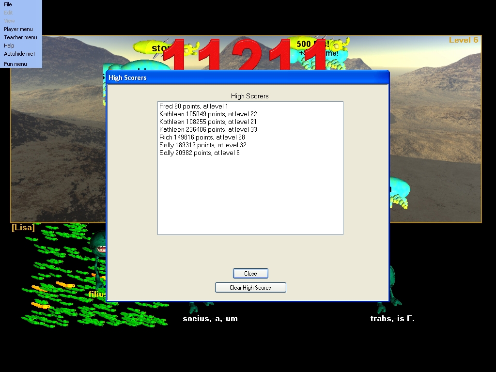 Clicking on the menu item brings up the High Scorers list: