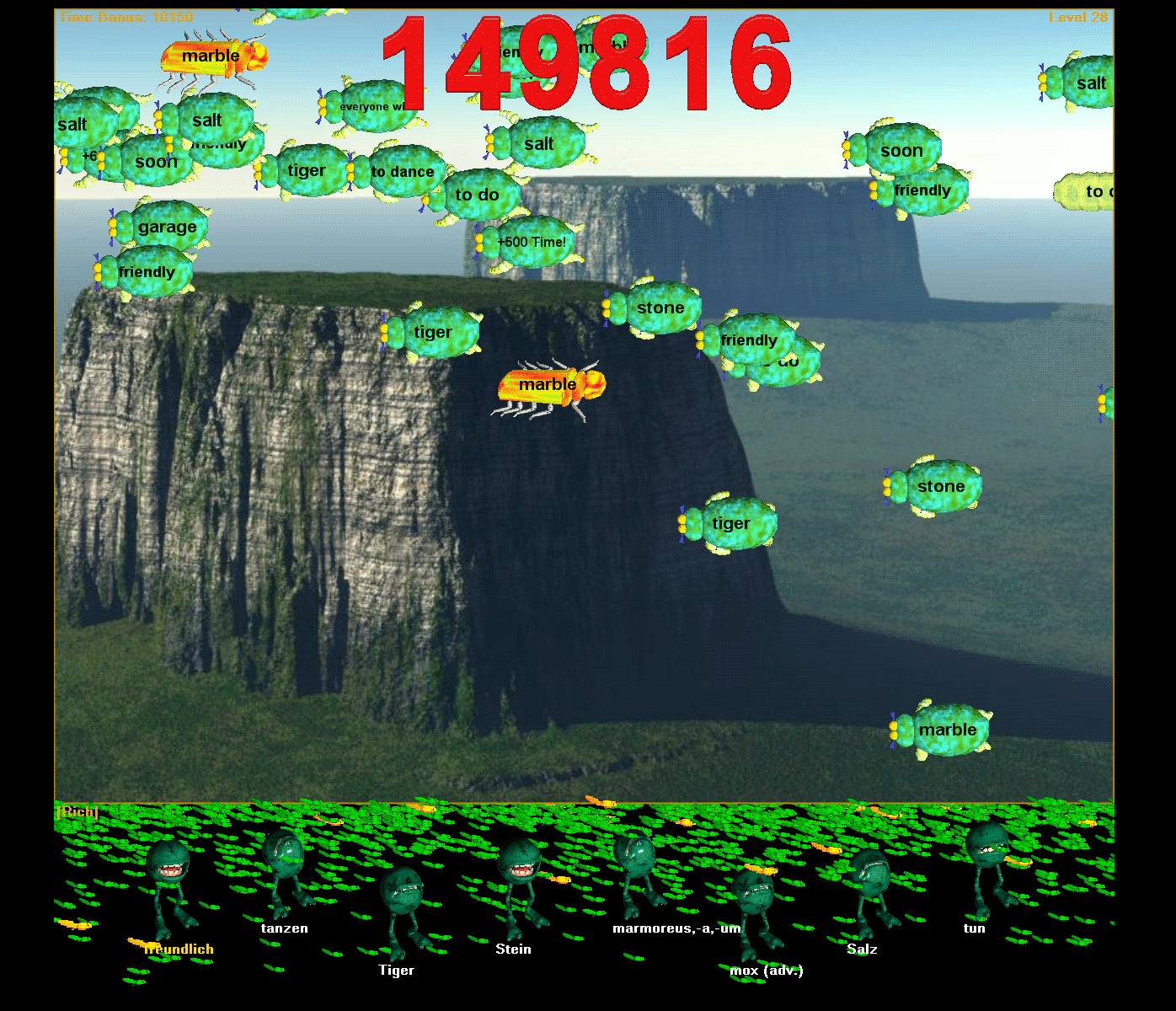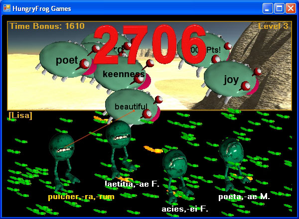Finally, here is a screen capture from a very small window with the Hungry Frog Latin software game running with the 'Use Full Screen' option turned off. You can see the grab bar, the minimize, maximize and close buttons in the top right and the 'sizable' borders of the window. If you want to change the size of the window, just grab an edge and move it to resize the window. To run across multiple monitors at the same time, just enlarge the window to cover more than one display.